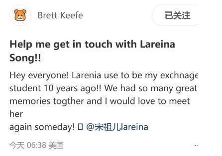 一位账号为“Brett Keefe”的美国帅哥,今天发布了一个帮助贴:“帮我联系宋祖儿”,还at了宋祖儿的小红书账号,并解释道: